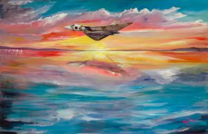 Jacqui has been an active member of the Fine Art Trade Guild, for many years, doing shows in the States and the NEC and was inspired to paint the ‘Last Flight of the Bomber’ as it flew unexpectedly over Sandbanks late one afternoon after the Shoreham Air Crash. Unable to fly over Shoreham Air Show, the Vulcan Pilot decided to fly out over Poole Bay and over towards Swanage. The sky was just turning red with the sunset and the reflection on Poole bay was amazing. Painted from memory it took Jacqui nearly two months to finish as she paint in thin layers of oil, obtaining a 3D effect on the piece.